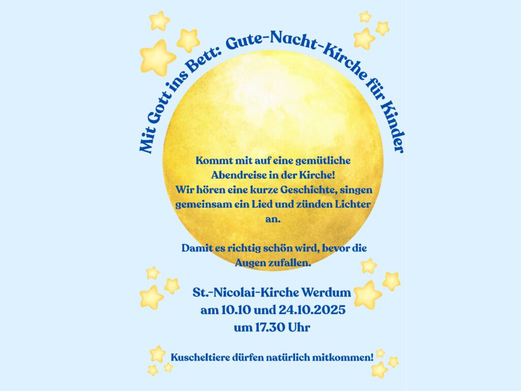 Die St.-Nicolai-Kirche in Werdum lädt im Oktober Kinder und ihre Familien zu einer besonderen Abendandacht ein: der Gute-Nacht-Kirche. Unter dem Motto „Gute-Nacht-Kirche“ können sich die jungen Besucherinnen und Besucher auf eine gemütliche Abendreise in der Kirche begeben.