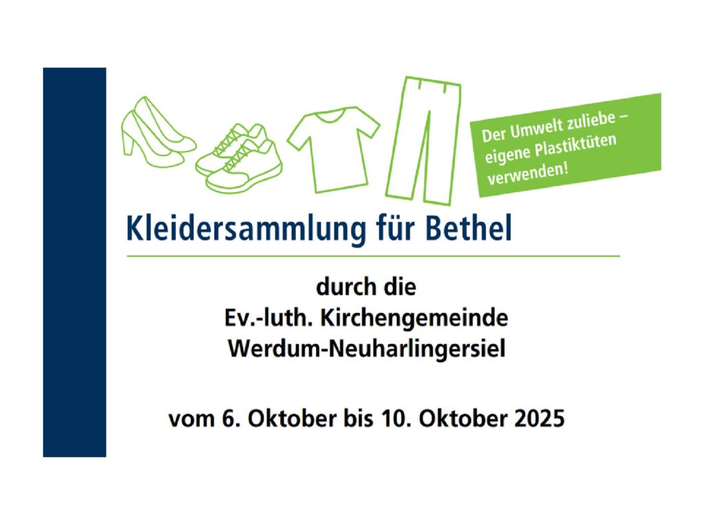 Auch in diesem Jahr beteiligt sich die Ev.-luth. Kirchengemeinde Werdum-Neuharlingersiel wieder an der großen Kleidersammlung für Bethel. Vom 6. bis 10. Oktober 2025 können die Spenden im Gemeindehaus Werdum, An der Kirche 6, abgegeben werden.