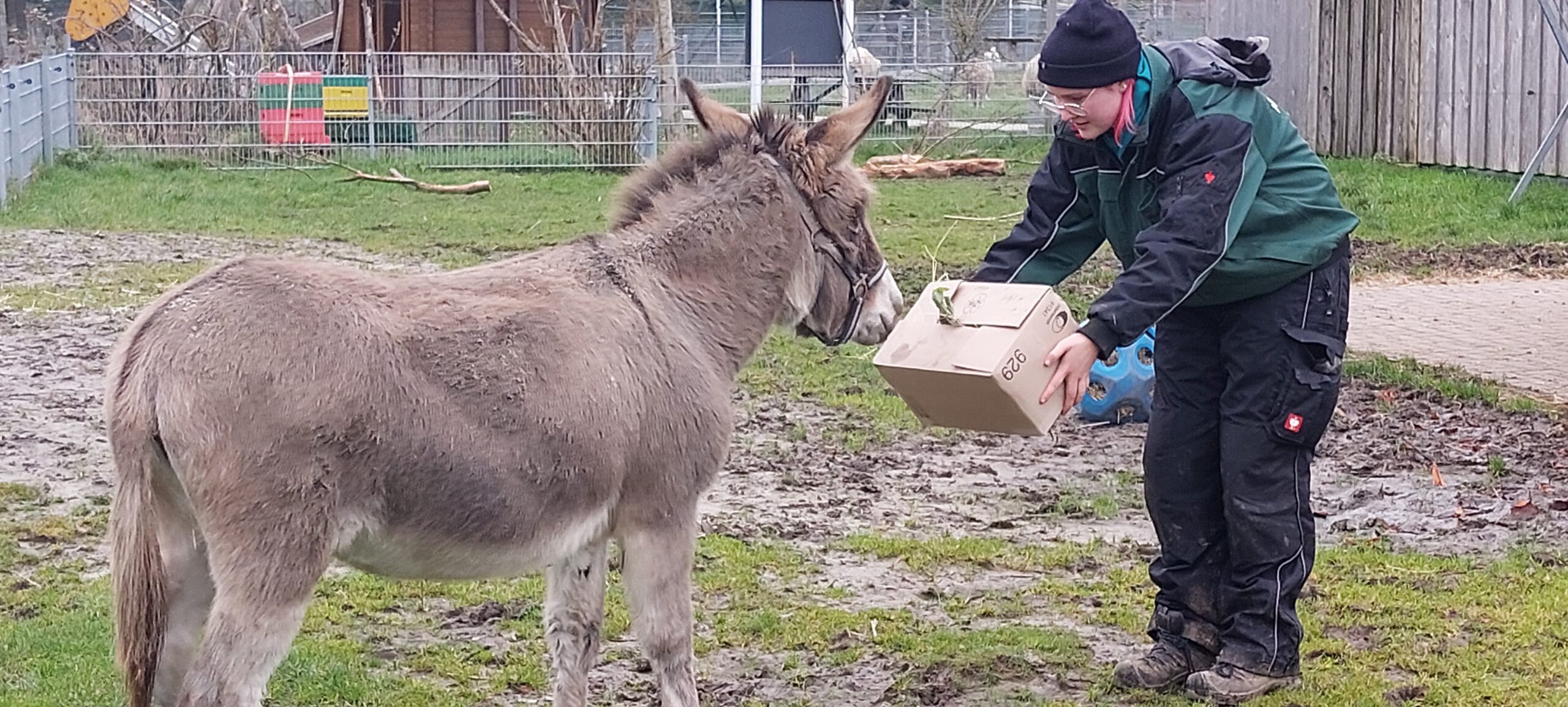 Während die beiden jungen Bulgaren-Esel entspannt ihr Fohlenfutter genießen, erlebt Eselstute Gesa im Haustierpark Werdum eine besondere Überraschung. Die Mitarbeitenden beschäftigen sie mit einer liebevoll gepackten „Eselpost“: einem kleinen Paket voller Leckereien. Darin waren unter anderem getrocknete Brötchen, duftendes Heu, … weiterlesen