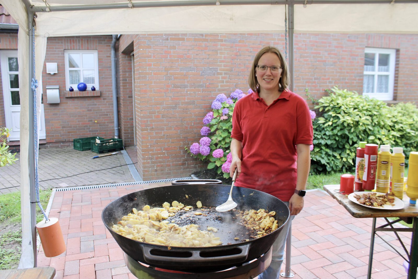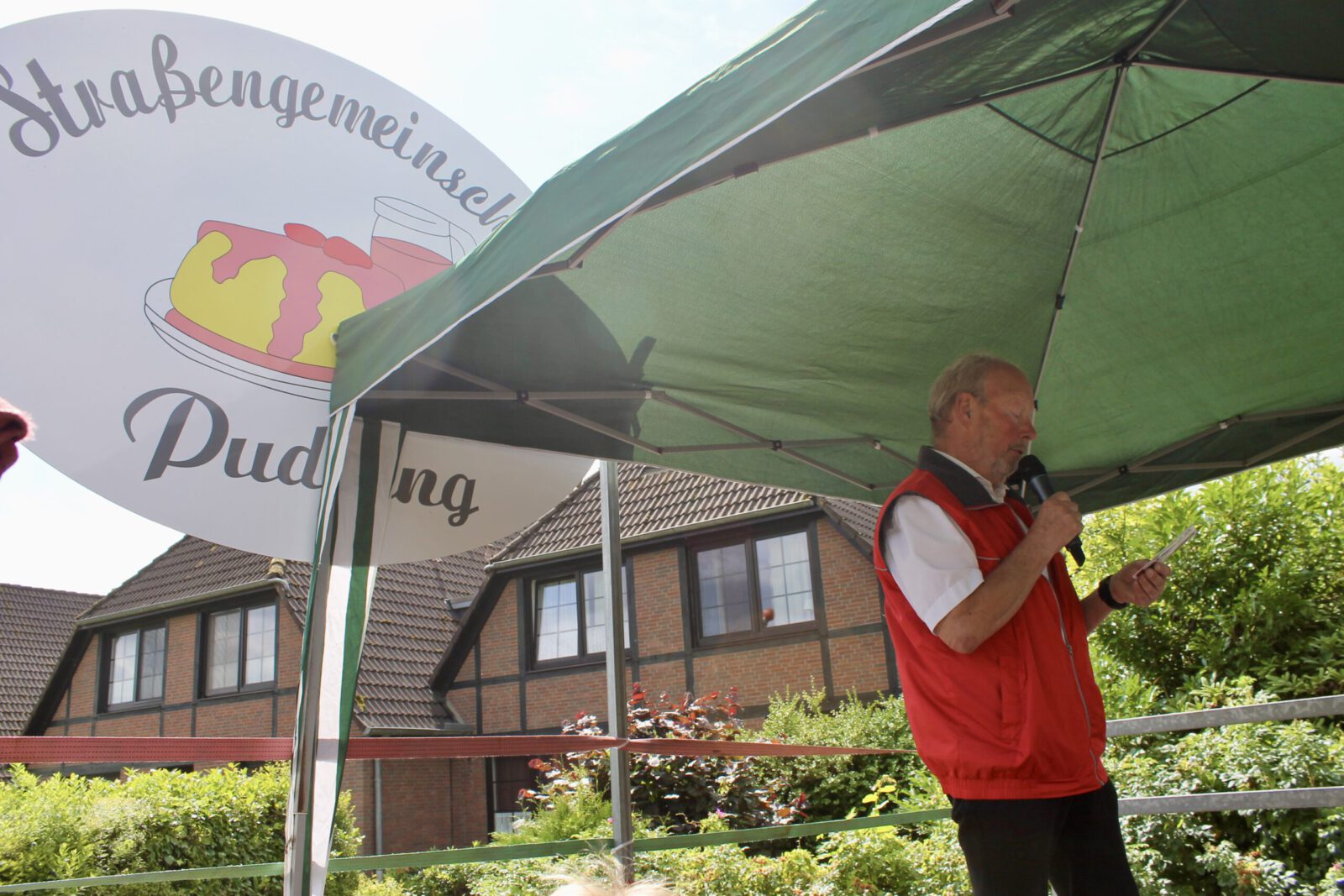 Um 10.00 Uhr morgens begann das Fest mit einem Gottesdienst von Pastorin Julia Uelsmann. Trotz starken Regens versammelten sich zahlreiche Menschen im Zelt, um gemeinsam zu singen und zu beten. Bürgermeister René Weiler-Rodenbäck eröffnete offiziell das. Er betonte die besondere Bedeutung der Thunumer Straße und der engagierten Straßengemeinschaft „Der Pudding“, die das Fest bereits seit rund 30 Jahren organisiert. Er dankte dem „Pudding“ herzlich für seinen Einsatz. Auch Kalle Ockenga richtete einige Worte an die Besucher. Er zeigte sich erfreut über die große Beteiligung und das gefüllte Zelt, sprach seine Dankbarkeit für die Werdumer Pastorin aus und blickte auf die Geschichte der Straße zurück. In Eigenleistung wurde die Thunumer Straße vor etwa drei Jahrzehnten erbaut, – eine Leistung, auf die alle Beteiligten mit Recht stolz sein dürfen.