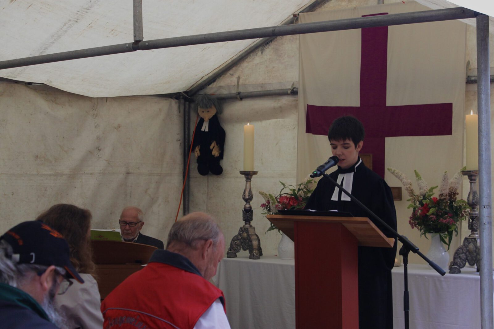 Um 10.00 Uhr morgens begann das Fest mit einem Gottesdienst von Pastorin Julia Uelsmann. Trotz starken Regens versammelten sich zahlreiche Menschen im Zelt, um gemeinsam zu singen und zu beten. Bürgermeister René Weiler-Rodenbäck eröffnete offiziell das. Er betonte die besondere Bedeutung der Thunumer Straße und der engagierten Straßengemeinschaft „Der Pudding“, die das Fest bereits seit rund 30 Jahren organisiert. Er dankte dem „Pudding“ herzlich für seinen Einsatz. Auch Kalle Ockenga richtete einige Worte an die Besucher. Er zeigte sich erfreut über die große Beteiligung und das gefüllte Zelt, sprach seine Dankbarkeit für die Werdumer Pastorin aus und blickte auf die Geschichte der Straße zurück. In Eigenleistung wurde die Thunumer Straße vor etwa drei Jahrzehnten erbaut, – eine Leistung, auf die alle Beteiligten mit Recht stolz sein dürfen.