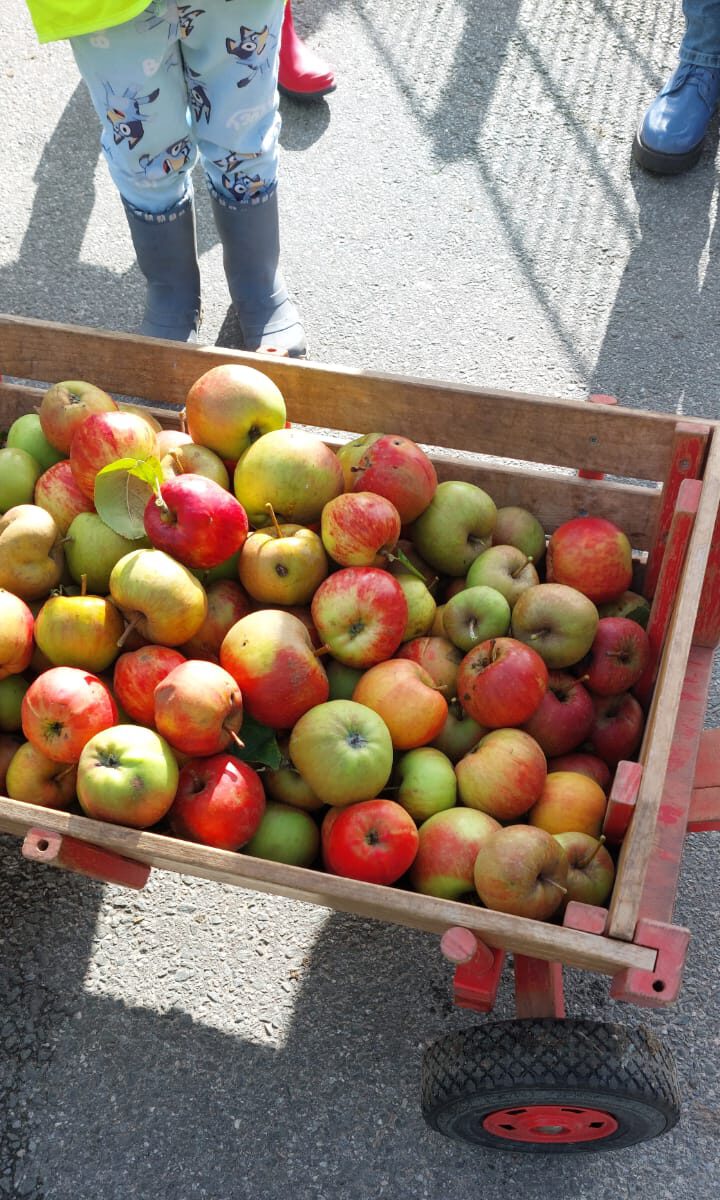 Ein Handwagen wurde mit einer Mischung aus großen und kleinen Äpfeln gefüllt. Während der Tätigkeit erhielten die Kinder Informationen über die Pflege der Bäume sowie über die Bedeutung regional erzeugter Lebensmittel.