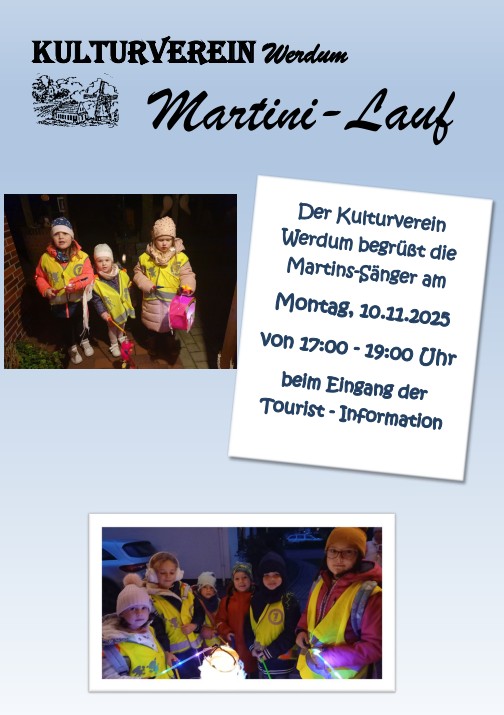 Jedes Jahr am 10. November lebt auch in Werdum die Tradition des Martini-Singens auf. Die Kinder ziehen mit ihren oft selbstgebastelten Laternen zu Ehren von Martin Luther von Haus zu Haus und singen vorher einstudierte Lieder wie „Martinus Luther“, „Laterne, Laterne, Sonne, Mond und Sterne“ oder „Mien Lüttje Lateern“. Viele Werdumer warten dann auf die Kleinen und Großen und belohnen sie für ihren Gesang mit etlichen Leckereien. Nach dem erfolgreichen Start ist auch der Kulturverein wieder Anlaufstelle. Im Eingang vom „Dörphuus“ warten Herta Daniels und Christa und Rainer Vollenbruch bei Einbruch der Dunkelheit auf die „Martini-Sänger“.