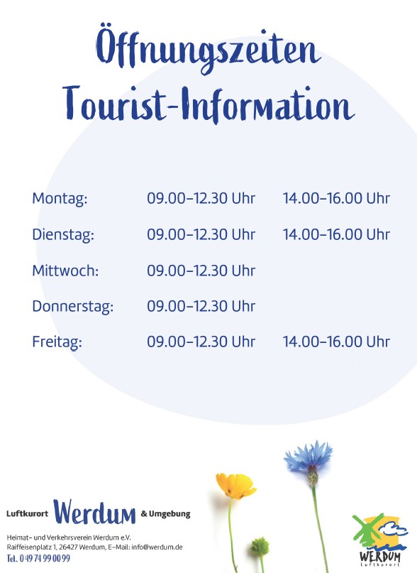 So langsam kehrt etwas Ruhe im Ort ein. Und das merkt man auch in der Tourist-Information im Dörphuus. Daher reduziert der Heimat- und Verkehrsverein Werdum, wie jedes Jahr, seine Öffnungszeiten. Ab sofort ist die Tourist-Information montags bis freitags von 09.00-12.30 Uhr geöffnet. Zusätzlich ist am Montag, Dienstag und Freitag auch am Nachmittag von 14.00-16.00 Uhr die Tourist-Information besetzt. Die verlängerten Öffnungszeiten beginnen dann wieder Ende März zum Start der Saison 2026.