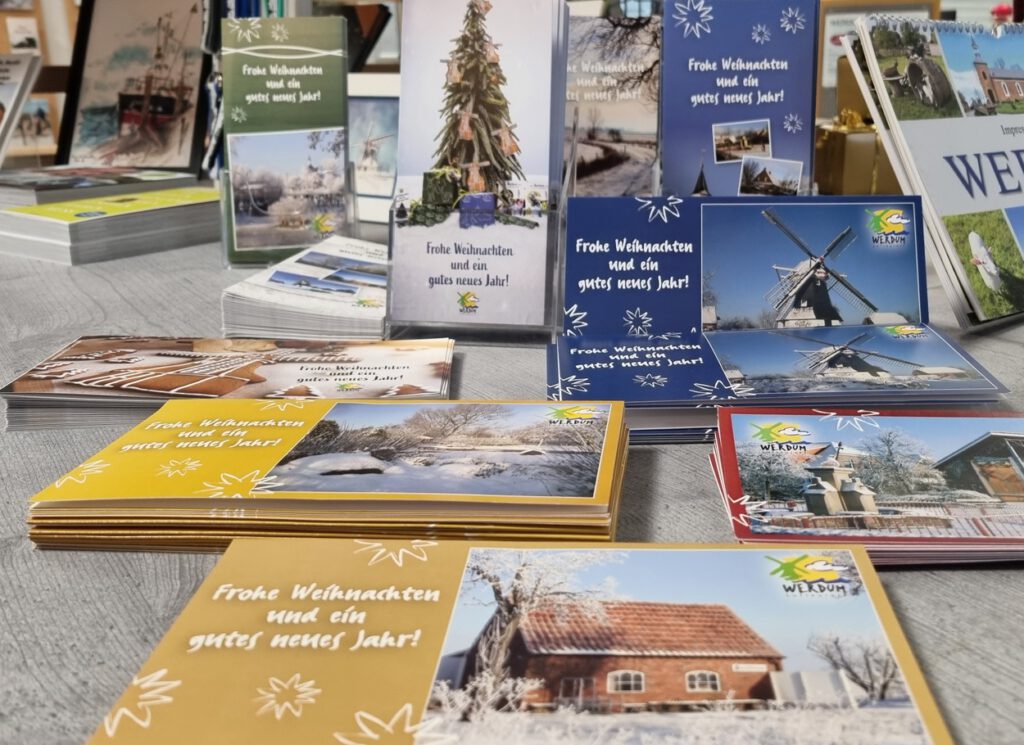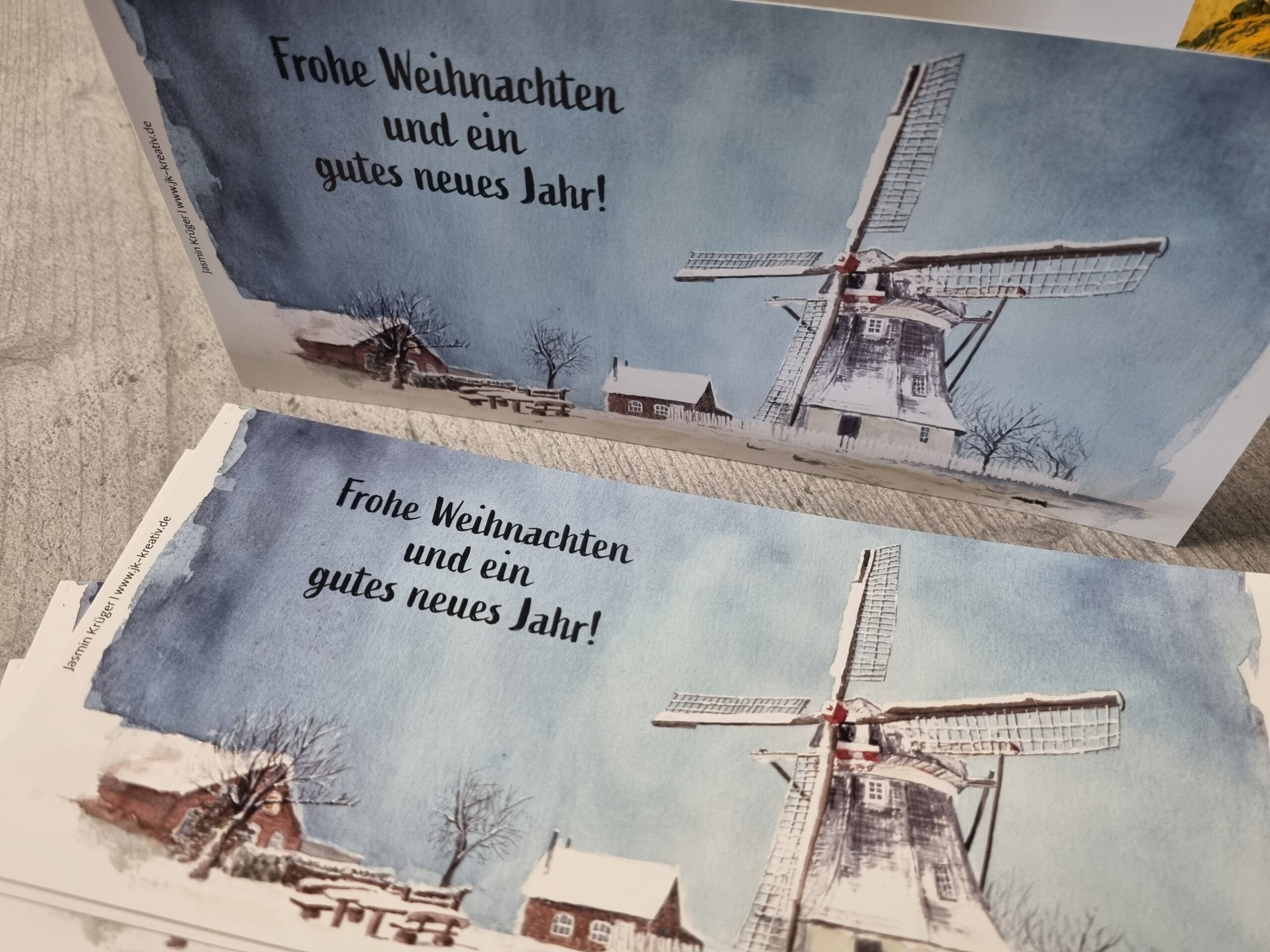 Die neue Weihnachtskarte für 2025 ist eingetroffen. Dieses Jahr zeigt das Motiv die Museumswiese im winterlichen Gewand. Gezeichnet wurde das Bild von der Künstlerin Jasmin Krüger aus Haan, welches dann von der Werbeagentur Atelier de Vincent als Weihnachtskarte gestaltet wurde. Die Weihnachtskarten sind für 1,50 € in der Tourist-Information erhältlich. Die Auflage ist limitiert, deshalb ist es empfehlenswert sich rechtzeitig die nötigen Karten zu sichern. Wie immer können auch die Motive aus den letzten Jahren, sofern noch auf Lager, gekauft werden.