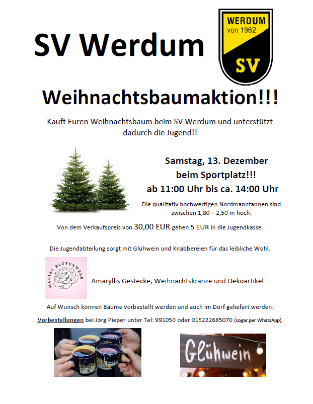 Die Weihnachtsvorbereitungen laufen überall auf Hochtouren. So langsam kommt natürlich auch die Beschaffung eines passenden Weihnachtsbaums in den Blick. In Werdum haben wir ja Glück; der SV Werdum hat wieder Bäume geordert und bietet diese am Samstag ab 11.00 Uhr zum Verkauf im Sportzentrum an. 30 € kosten die hochwertigen Nordmanntannen, wovon wieder 5 € in die Jugendkasse wandern. „Viele sind schon vorbestellt, wer also sich seinen Baum noch sichern will, sollte entweder sehr pünktlich kommen oder sich bei mir vorab melden“ so SV-Vorsitzender Jörg Pieper, der sich mit seiner Mannschaft über das erneut sehr große Interesse freut und auch wieder einen Liefer-Service anbietet. Glühwein und Knabbereien machen die Abholung auch wieder zu einem Erlebnis.