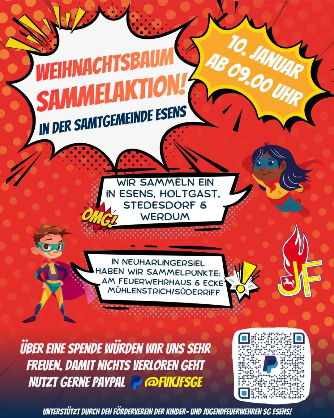 Weihnachten ist vorbei und das neue Jahr hat begonnen. So ist es langsam Zeit sich über den Verbleib des Weihnachtsbaums Gedanken zu machen. In der Samtgemeinde Esens und somit auch in Werdum im Ortskern ist das aber kein Problem. Die ausgedienten Bäume werden abgeholt. Die Jugendfeuerwehren sammeln diese am 10. Januar ab 09.00 Uhr ein und entsorgen sie. Also rechtzeitig die Bäume an die Straße legen und an eine kleine oder große Spende für die Jugendfeuerwehr denken.