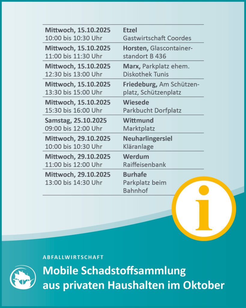Am Mittwoch, den 29. Oktober 2025, macht das Schadstoffmobil des Landkreises Wittmund wieder Station in Werdum.